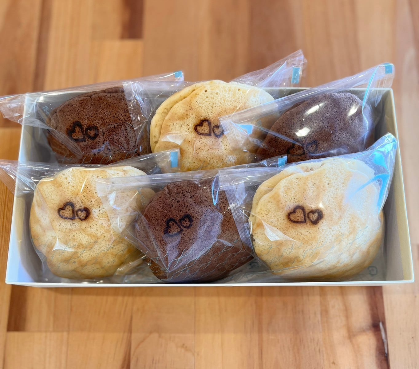 チョコ餡 北海道産小豆「ゆきむらさき」にチョコとミルクをたっぷり使用したチョコ餡をサンドしました。しっかりとチョコ味なのにくどくない、滑らかで口溶けのよいどら焼きです。今年は生地にもココアを加えて、さらに美味しく改良いたしました。