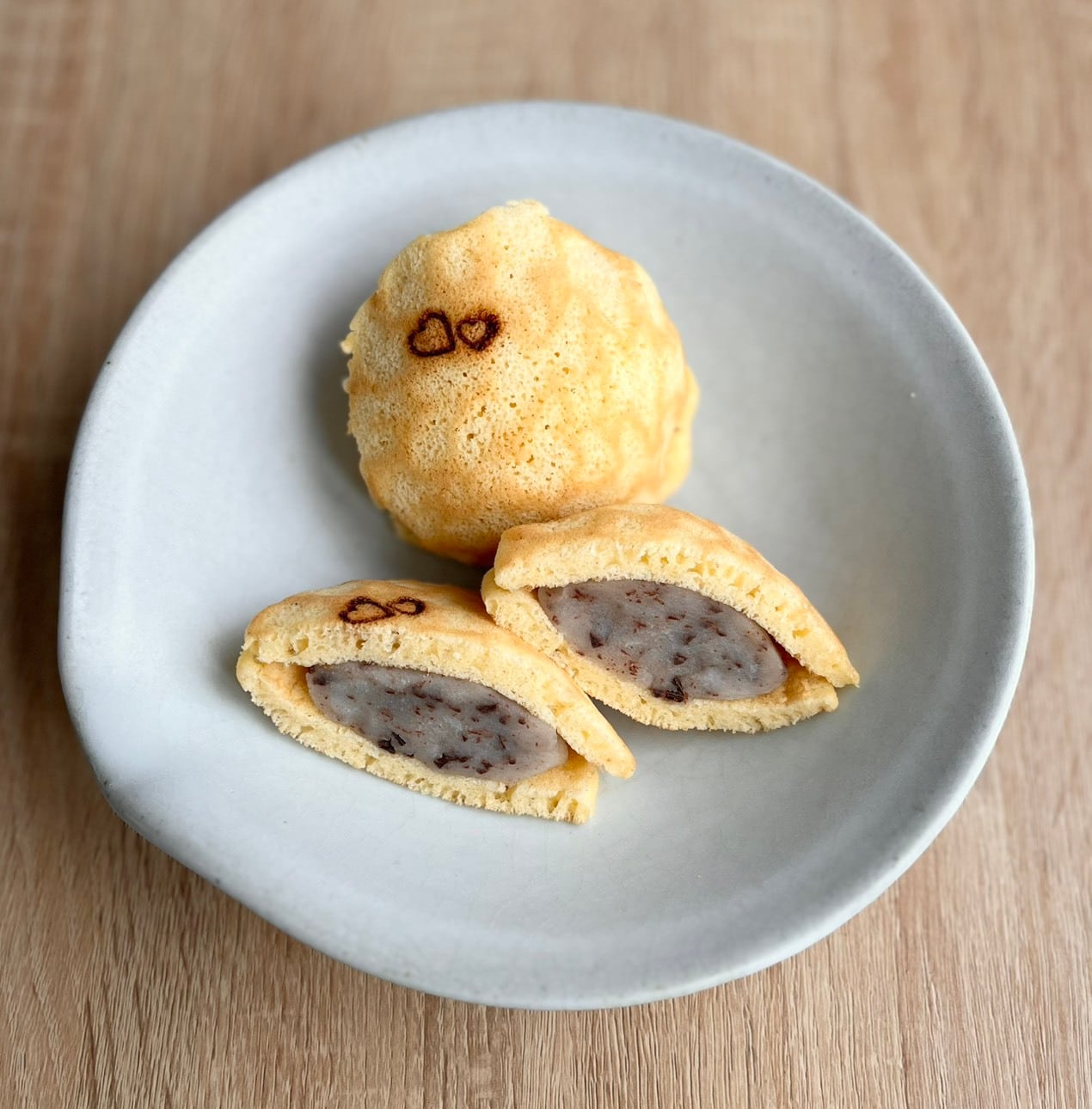 ホワイトチョコ餡 北海道産白小豆と大福豆をブレンドした白餡に、ホワイトチョコと刻んだミルクチョコの2種類を贅沢に混ぜ込みました。一見すると不思議な組み合わせですが、ふんわり生地とまろやかな甘さの餡に、刻んだチョコの食感がマッチしていて、店主オススメの逸品です。